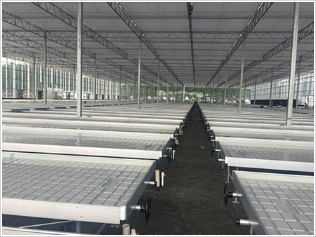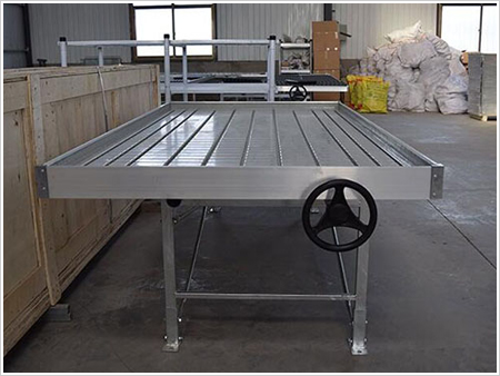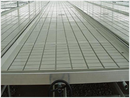 潮汐式灌溉移動(dòng)苗床栽培床是一種床面為塑料結(jié)構(gòu)的栽培床,其床面采用塑料制作的潮汐式苗盤,它又稱底部灌溉式栽培床。這種潮汐式灌溉移動(dòng)苗床采用基本與商品化金屬結(jié)構(gòu)栽培床相同的立柱、支撐,床面采用模壓成型的不透水塑料苗盤。灌溉時(shí),苗盤內(nèi)注滿清水或營(yíng)養(yǎng)液,并使其滯留一定的時(shí)間,以使作物依靠毛細(xì)作用通過花盆底部的排水孔吸收水分。之后灌溉水排出栽培床,或收集再利用,或直接排到當(dāng)?shù)氐南滤艿馈?/p>