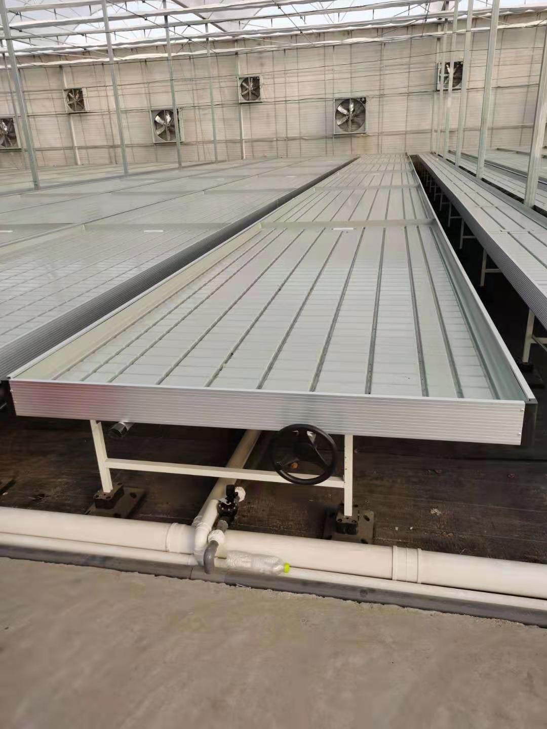 潮汐苗床面板材質均為可食用級別ABS環(huán)保材料,顏色為亮灰色,面板厚度為3毫米板材高溫電吸塑而成,面板分為兩種:一種為***立板,一種為拼接板,***立版需要每臺苗床上面均放置一套上下水系統(tǒng),拼接板為每臺苗床放置兩套上下水系統(tǒng),不同的設計應對不同的客戶要求,潮汐苗床支架均為螺桿微調熱鍍鋅支架,比原來的地腳調節(jié)更為精準,螺桿調節(jié)可謂解決了大家找平的一大難題。苗床尺寸的選擇目前國際上通用的潮汐式床箱的尺寸是4550mm*1690mm(長*寬)也就是我們常說的4.55米*1.7米床箱.因此我們在設計苗床時單個苗床長度應為4.55米的倍數,寬度應為1.7米的倍數,這樣可以使得苗床的利用率高,無浪費面積.根據平面圖上空地的長度及跨度大小,我們設計苗床為1.7m*18m和1.7m*22.5m兩種規(guī)格。苗床配置:本溫室共設置1.7m*18.2m的苗床37臺,1.7m*22.75m的苗床31臺,苗床面積為:平米。可放置潮汐式床箱數量為:303個。可放置穴盤數量為:14544個。